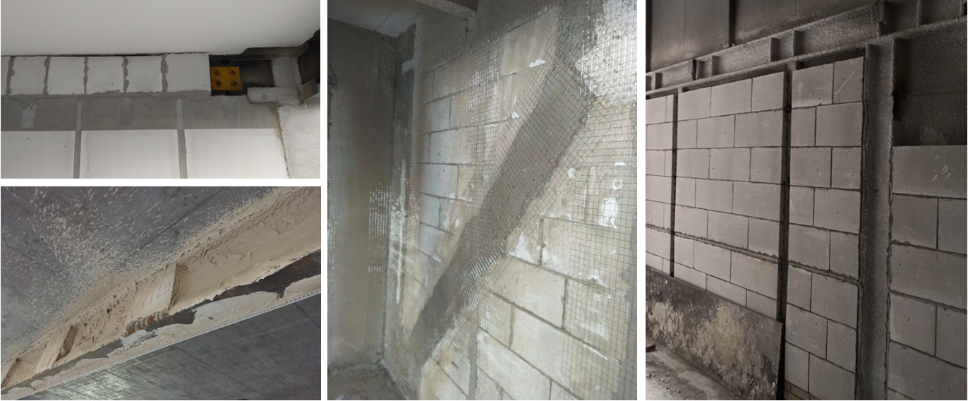 鋼結構的防火施工一般在二次結構之前完成,根據防火材料的不同,也可能在二次結構完成后施工,與具體的節點設計構造有關。鋼結構為了適應住宅的需求,避免凸梁凸柱,對鋼梁、鋼柱、鋼支撐、鋼板剪力墻的防火材料選用和節點構造要求,與鋼結構公共建筑有明顯的不同,比如鋼梁、鋼板剪力墻填充砌塊,鋼梁腹板兩側噴滿石膏漿料等新做法。防火的施工需要由專業廠家來完成,需要注意原材料檢驗、施工工藝、成型質量等問題,比如界面劑、拉結筋、掛網等。