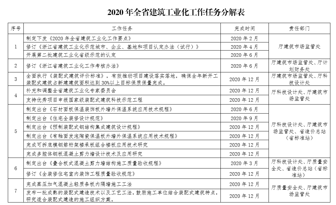 2020年3月2日,浙江省住建廳發布《2020年全省建筑工業化工作要點》(下文簡稱為《要點》),該《要點》進一步明確并分解了2019年7月浙江省提出的相關目標。