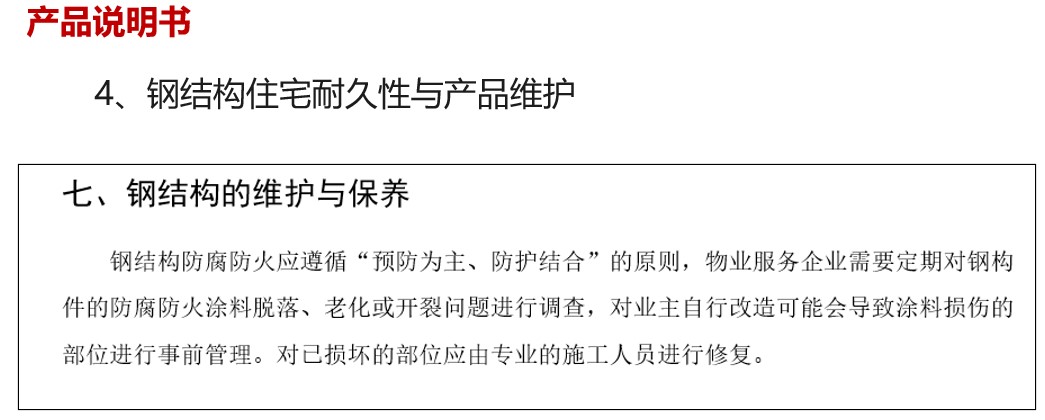 4、鋼結(jié)構(gòu)住宅耐久性與產(chǎn)品維護(hù)。任何產(chǎn)品都有耐久性與維護(hù)問題,鋼結(jié)構(gòu)住宅也不例外。產(chǎn)品維護(hù)保養(yǎng)一般是物業(yè)的事情,有房屋維修基金,與用戶關(guān)系不大。但說明書中也應(yīng)有這部分內(nèi)容,下一小結(jié)也會(huì)講述。