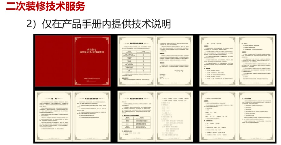 2、對(duì)于市場上面向中端以下大眾的普通住宅產(chǎn)品,至少應(yīng)該在產(chǎn)品說明書中提供二次裝修的技術(shù)說明。用戶可以通過自己查看產(chǎn)品說明書,學(xué)習(xí)了解相應(yīng)的技術(shù)指標(biāo),避免盲目裝修帶來不可控問題。