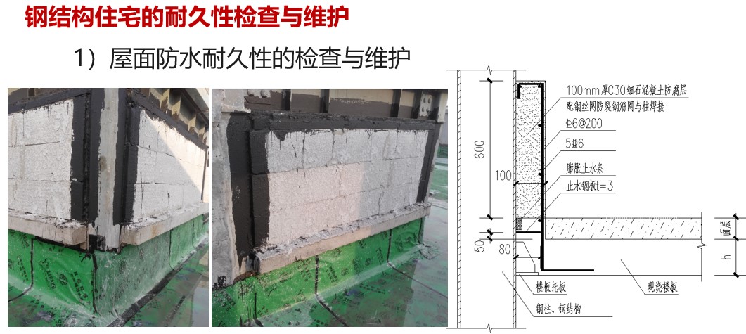 對(duì)于鋼結(jié)構(gòu)住宅中出屋面的鋼結(jié)構(gòu)節(jié)點(diǎn)處防水處理,應(yīng)給予重點(diǎn)關(guān)注。