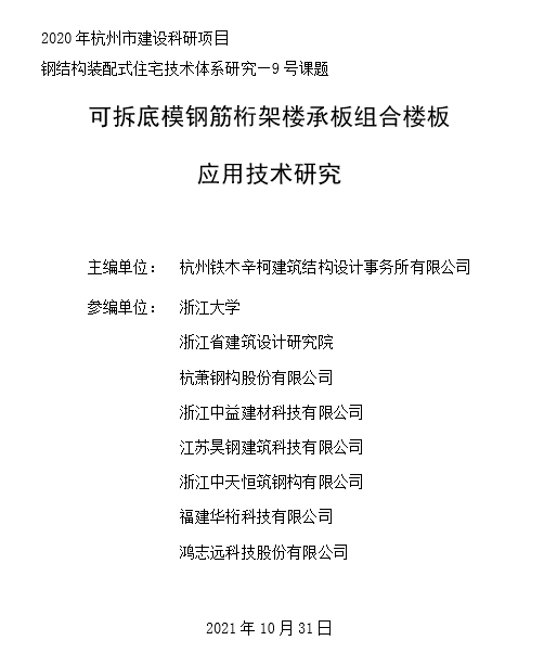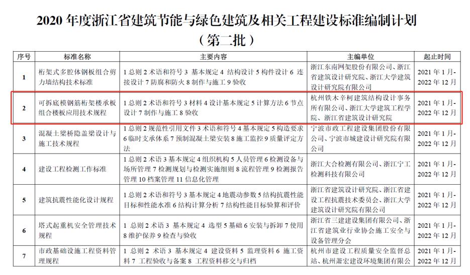 “可拆底模鋼筋桁架樓承板組合樓板應(yīng)用技術(shù)研究”已成功立項(xiàng)杭州市建設(shè)科研項(xiàng)目2020061,《可拆底模鋼筋桁架樓承板組合樓板應(yīng)用技術(shù)規(guī)程》已列入2020年度浙江省建筑節(jié)能與綠色建筑及相關(guān)工程建設(shè)標(biāo)準(zhǔn)編制計(jì)劃。